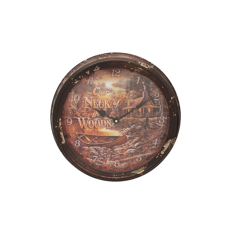 15" diameter glass covered Cabin Scene clock with tin outer frame features a great rusted / weathered looking finish. Uses 1 AA battery (not included).