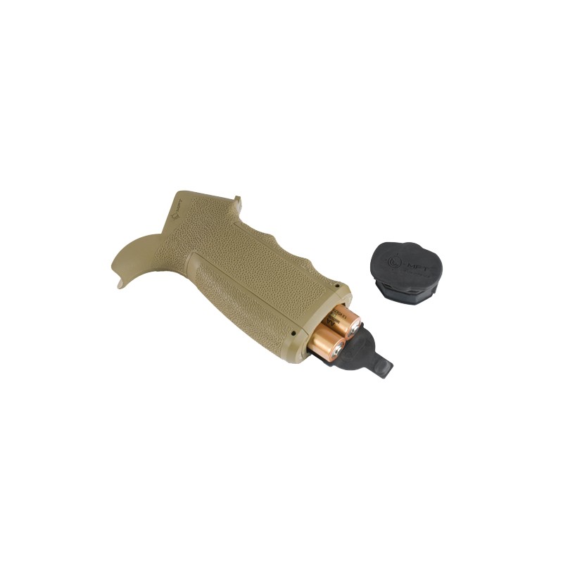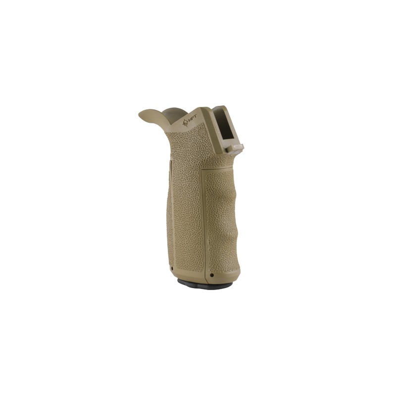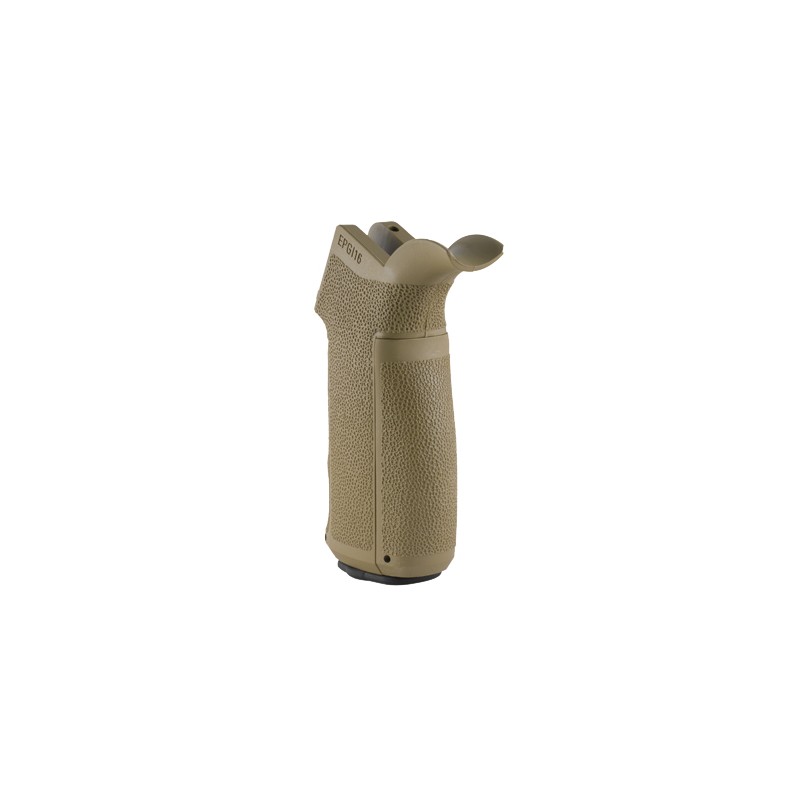 The Engage tactical pistol grip with interchangeable front and back straps (EPGI16) provides a combination of fit and function unequalled by the originally supplied M16/AR15/M4/HK416 pistol grip. Textured finger swells (3) and back straps (3) allow the user to custom fit the grip to their own hand size and comfort. A secure watertight storage compartment with customizable storage sled and a quick access tab diminishes all rattle.