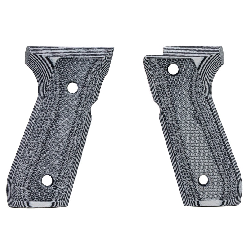 G-10 material is a fiberglass based epoxy resin laminate. It is an extremely tough and durable material that is impervious to moisture, weather or chemicals, making it a perfect material for handgun grips. The multiple layered construction allows the use of different colors to be added to the grips, creating attractive patterns as it is machined. Our Pachmayr G-10 Tactical pistol grips are available in two textures, the coarse Grappler pattern or fine checkered, and two color patterns, green/black and grey/black. Pachmayr G-10 Tactical grips are the toughest, most durable, and best looking grips on the market. Available to fit 1911's, Sig 238's and 938's, Ruger Mk III and 22/45's, Beretta 92's, and CZ 75's.