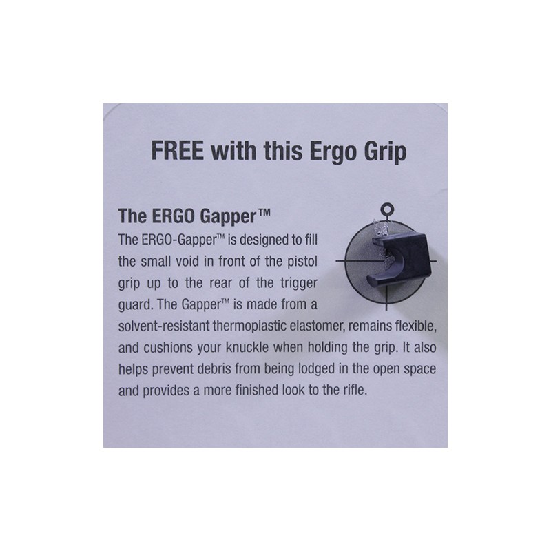 The ERGO Gapper is designed to fill the small void in front of the pistol grip up to the rear of the trigger guard. The Gapper is made from a solvent-resistant thermoplastic elastomer, remains flexible, and cushions your knuckle when holding the grip. It also helps prevent debris from being lodged in the open space and provides a more finished look to the rifle.