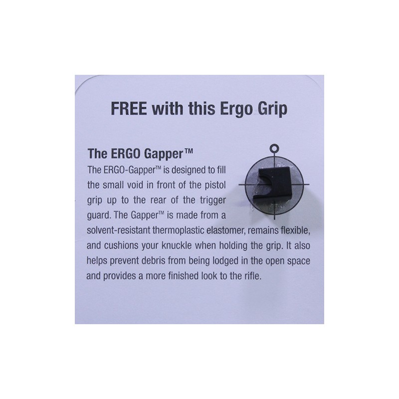 The ERGO Gapper is designed to fill the small void in front of the pistol grip up to the rear of the trigger guard. The Gapper is made from a solvent-resistant thermoplastic elastomer, remains flexible, and cushions your knuckle when holding the grip. It also helps prevent debris from being lodged in the open space and provides a more finished look to the rifle.