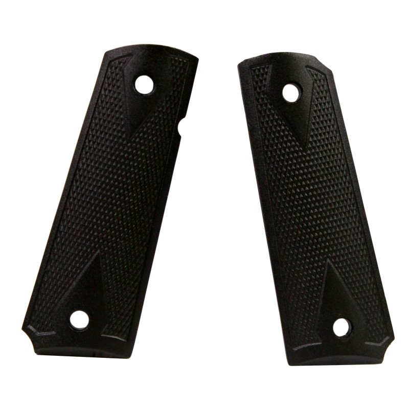 Pachmayrs Custom Series Aluminum grips are a stylish, tough and lightweight addition to your 1911 or Sig 938 pistol. The double-diamond checkering pattern adds classic good looks, while providing a non-slip grip surface. The black anodized aluminum grips are strong and impervious to weather or chemicals, and will also work on models with ambidextrous safeties.
