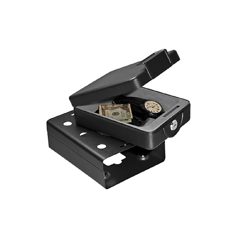 This compact key lock safe is perfect for locking your valuables inside your vehicle boat, home, RV or office or wherever you need to secure down the security lock box. Steel mounting sleeve has six pre-drilled holes and mounting hardware included for easy installation. Once the sleeve is mounted the sleeve holds the lock box in place. Only the key will release the box from the sleeve. The lock box can be mounted almost anywhere hidden away from prying eyes. When you want to move the safe, unlock the safe from the sleeve and take it with you. To open the safe insert and turn the key and lift safe door to open.