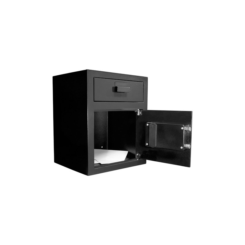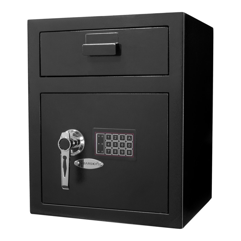 Large Keypad Depository Safe by Barska Instead of leaving large bills and extra cash inside the register, simply drop the items of value such as coin bags into the access portal in the safe where it stays safely out of reach. The anti-fishing baffles and jagged edge teeth on the door drop slot behind the door, prevents someone from fishing out money or deposit bags with a tool or a coat hanger.