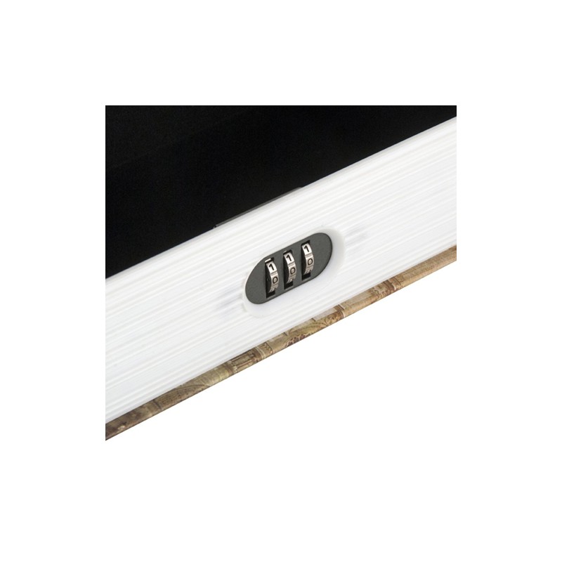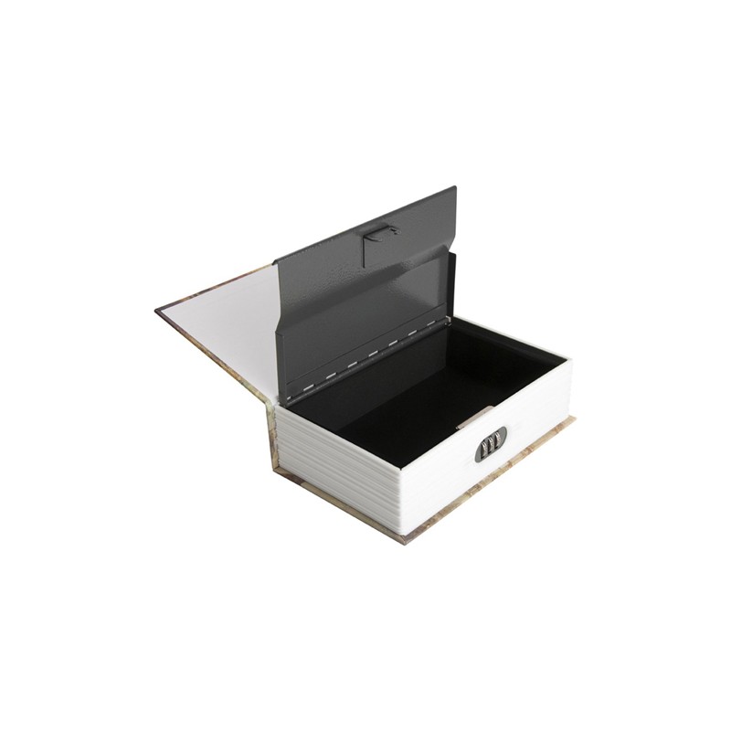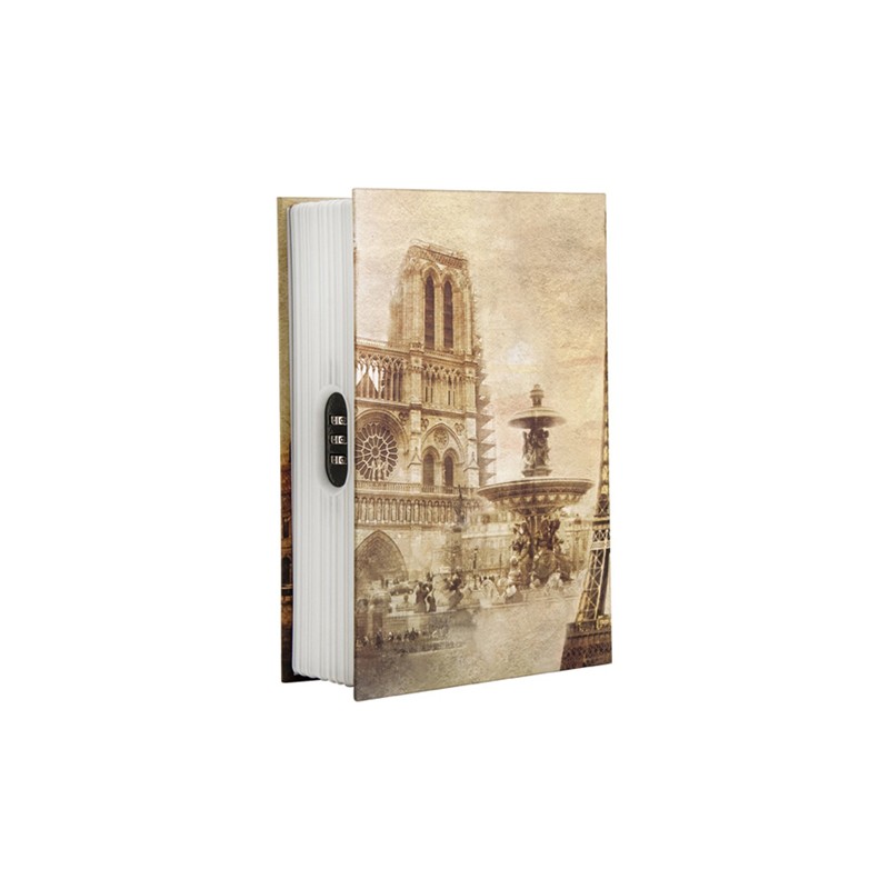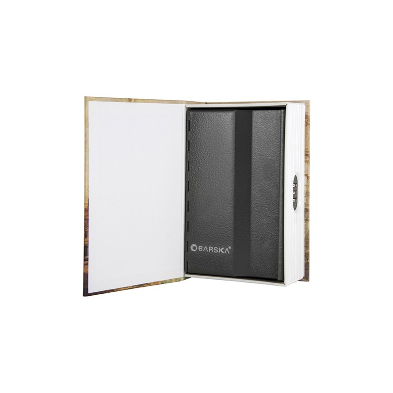 The Paris Book Lock Box with Combination Lock by Barska features a solid steel construction in a compact lightweight design. This compact safe is disguise to appear like a hard back book. The interior features a strong compact steel safe. Easily portable design that can be stored and hidden in plain view for safekeeping. Features a resettable combination lock. Ideal for safely hiding valuables, storing money, passports, and jewelry.