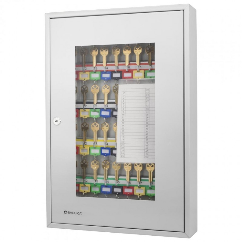 The 50 Position Key Lock Box from Barska features a hook-style cabinet that makes key organization easy and convenient. Included colored key tags allow the user to label each key for easy identification, and a glass door for quickly viewing the contents inside. The 50 Key Lock Box has four pre-drilled mounting holes and included hardware for installation.