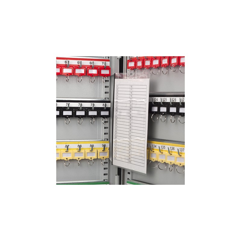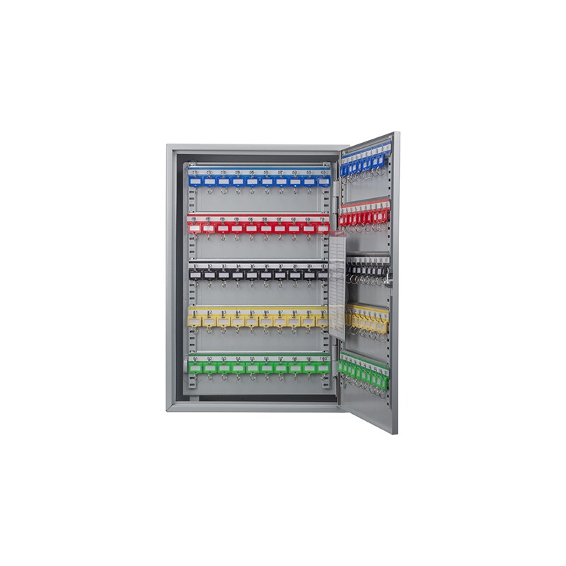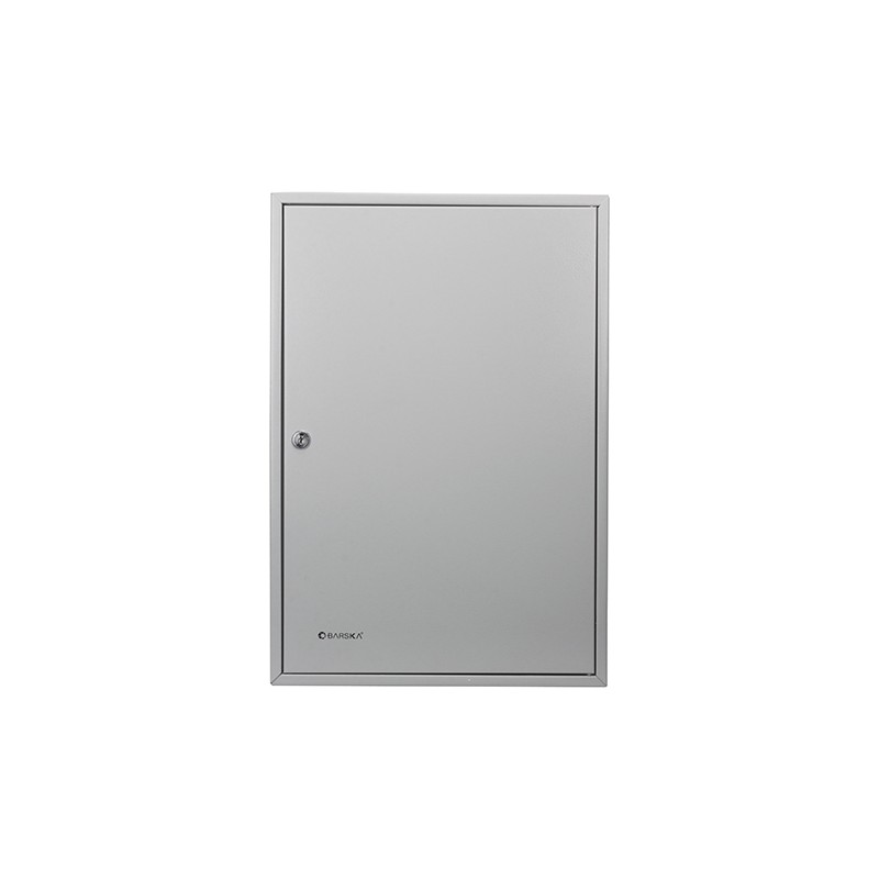 The 150 Position Key Lock Box from Barska features a hook-style cabinet that makes key organization easy and convenient. Inside the cabinet are six rows of color-coded and numbered hooks, each of which is easy to access and keep track of thanks to the included key index. The two-sided indexing chart has ample room to document the keys hook position corresponding lock, and a drop-in plastic sleeve tethered to the hinge inside the safe provides a hands-free reference.The safe has pre-drilled mounting holes and included hardware for installation.The safe walls and door are constructed of 0.8mm solid steel and finished with a matte black coating.