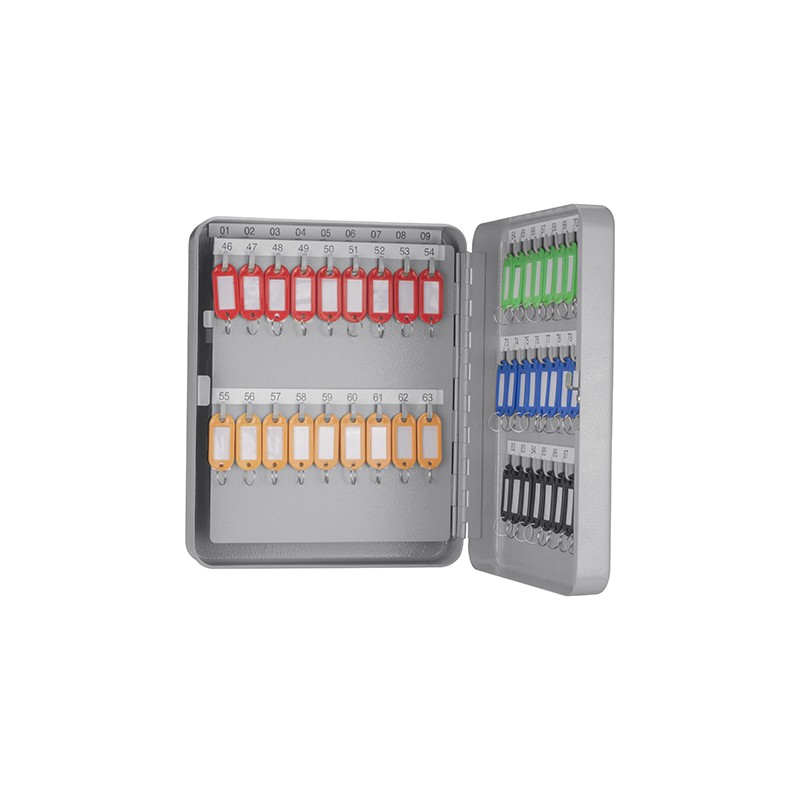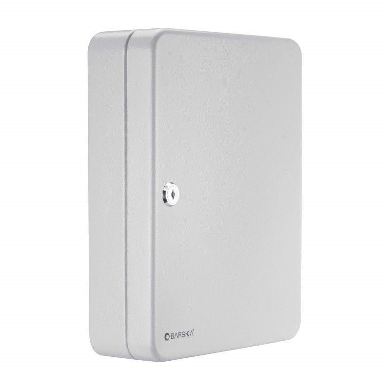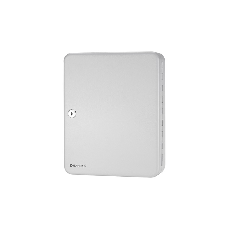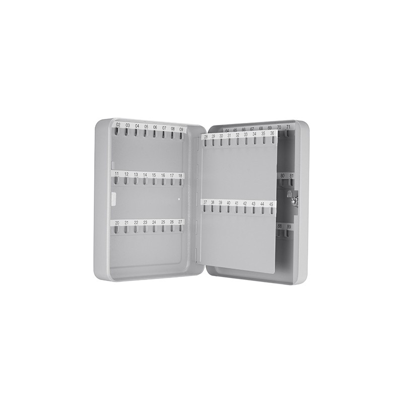 The 90 Position Key Lock Box from Barska features a hook-style cabinet that makes key organization easy and convenient. Inside the cabinet are 10 rows of numbered hooks, allowing the user to quickly locate and retrieve the needed key. A center divider provides even more storage for up to 90 keys in this compact key cabinet. The key box has four pre-drilled mounting holes and included hardware for installation. The cabinet walls and door are constructed of 0.8mm solid steel and finished with a gray coating.