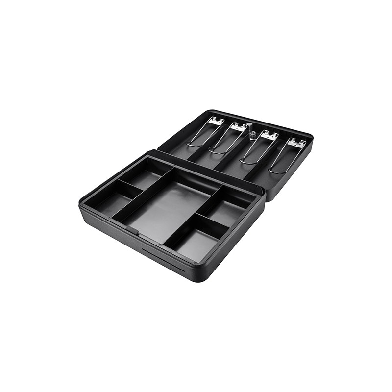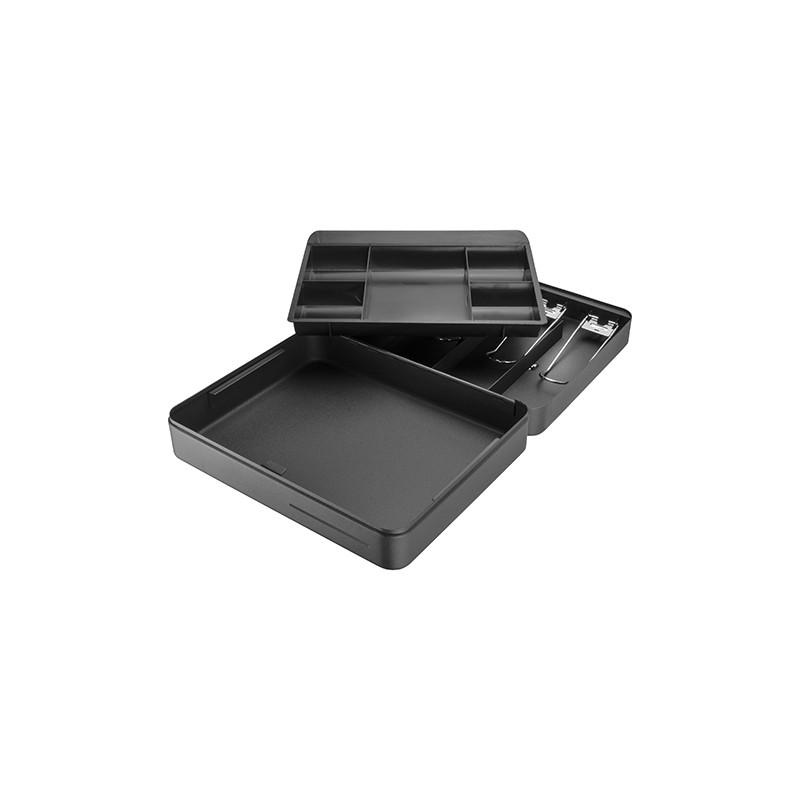The Standard Fold Out Cash Box by Barska is ideal for conducting cash transactions while on the go. A tough steel construction and internal organization trays help keep cash secured and organized. The 4 section coin tray lifts to reveal more storage space underneath. A quick-access drop slot allows anyone to drop off important receipts without having to open the cash box. This standard size cash box features a convenient carry handle for enhanced portability.