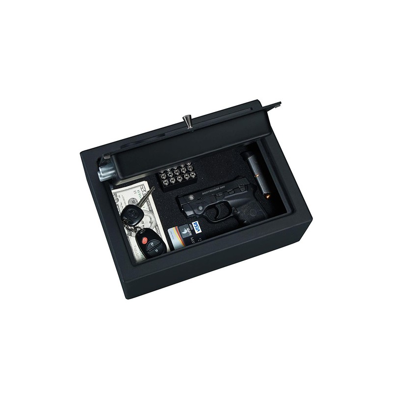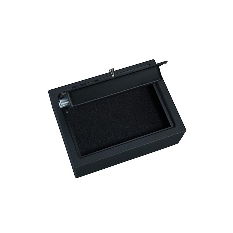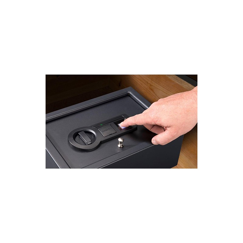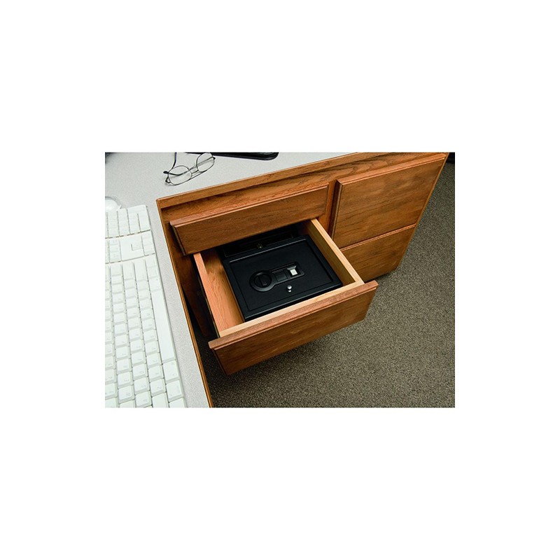 This Stack-On Drawer Safe fits in a nightstand, desk or file drawer, and provides fast, reliable access to handguns or other valuables with an electronic or biometric lock. The foam-padded bottom protects contents from damage. Pre-drilled holes and and all hardware are provided in order to secure the safe.