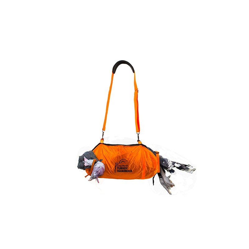 The Long Beard Turkey Hammock is an innovative way for carrying out your gobbler hands-free. The hammock conveniently contains the wings and legs preventing them from catching on brush and branches during your walk back to the truck. The side strap restrains the head and limits the amount of blood dripping down your backside. The turkey hammock also promotes safety with its blaze orange rip-stop fabric and shoulder strap, which ensure proper visibility to nearby hunters. The blaze orange shoulder strap also doubles as a safety marker to indicate your position in the woods when calling in your long beard. The entire turkey hammock packs into its own attached camo (Mossy Oak NWTF Obsession) pouch and weighs less than 12 ounces. The carabiner clip on the pouch also allows you to just snap it onto your turkey vest. The Long Beard Turkey Hammock is also a great tool for carrying in your decoys in the predawn hours.