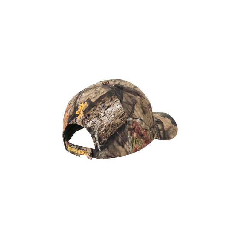 The Rimfire Cap in Mossy Oak Break-Up Country features a robust hook and loop back closure that's secure, yet easy to adjust. The embroidered yellow logo on front is not too bright to scare game but looks fantastic when you wear it around town. On the back you have the Browning logotype plus a second buckmark.