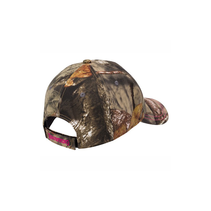 Pursuit Cap - Mossy Oak Break-Up Country, With Hook and loop closure, six-panel women's cap with raised white and pink Buckmark, contrasting magenta thread, and Mossy Oak Break-Up Country camo