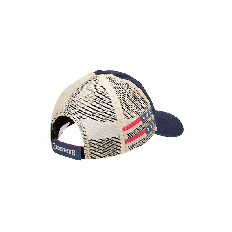 Browning Stars and Stripes Cap, With Hook and loop, meshback women's cap with raised embroidered Buckmark and stars and stripes side patches.
