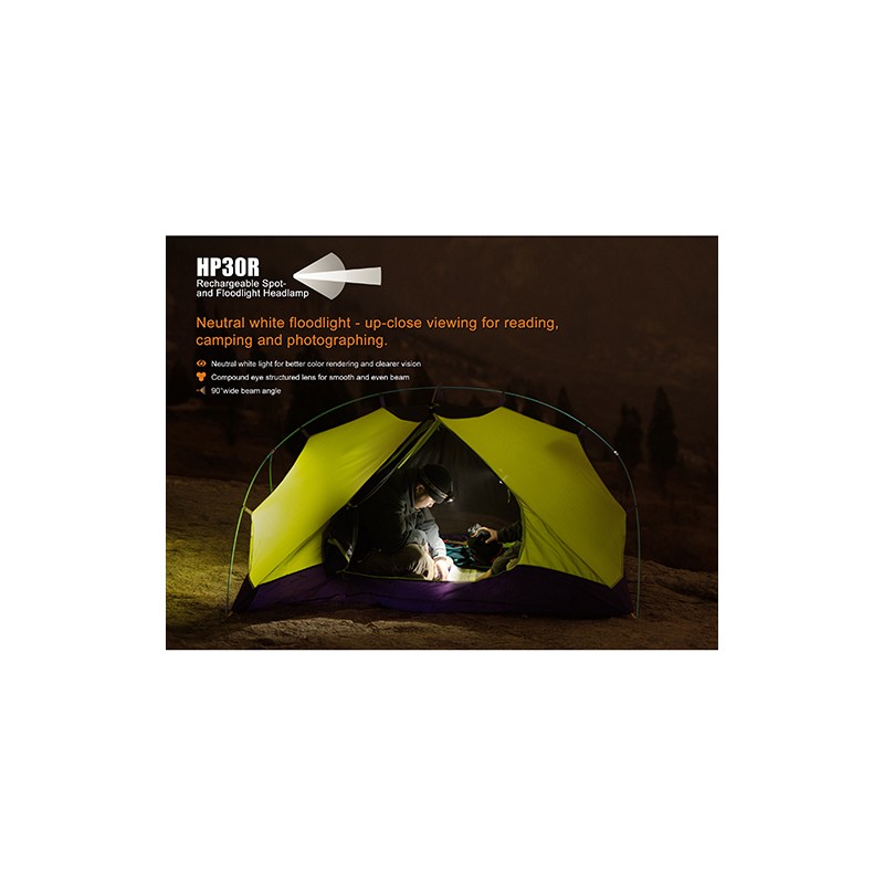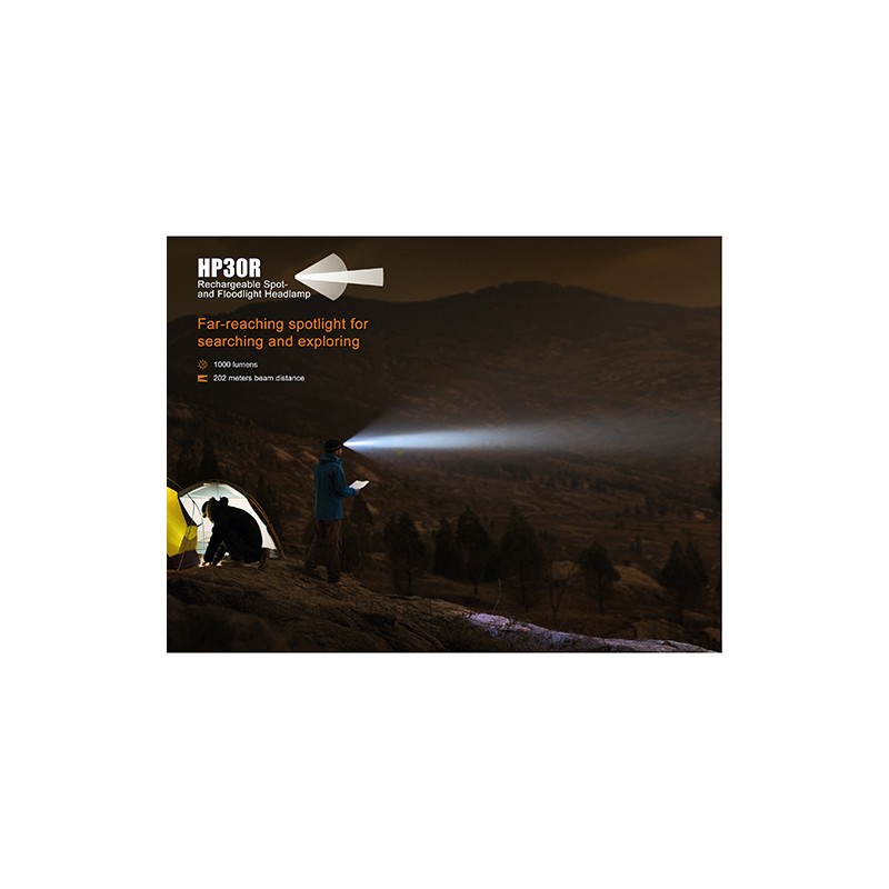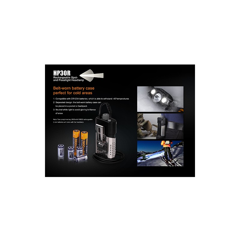 The Fenix HP30R LED headlamp is the absolute beast of a LED headlamp that everyone has been looking for. The Fenix HP30R LED headlamp produces a max output of 1750 lumens. The Fenix HP30R is a headlamp with a separate battery case, powered by two 18650 Li-ion batteries or it can also run off four CR123A batteries. The belt-worn battery case reduces the load bearing of users head and maintains optimal performance in cold areas. This headlamp is rechargeable via the Micro USB port in the battery case, and the battery can be used as a power bank. Featuring four white spotlight and neutral white floodlight output levels, the spot- and floodlight can be used simultaneously or separately to deliver a max output of 1750 lumens, runtime of 400 hours and a far-reaching beam of 663 feet/202 meters. The HP30R will be an indispensable aid in your mountaineering, searching, snow-hiking or any other challenging outdoor activities.
