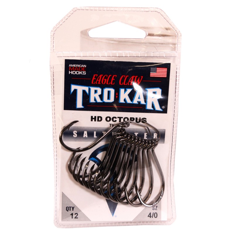 TroKar TK24, Heavy Wire Octopus Hook Designed by Eagle Claw with it's heavy duty octopus hook with a curved point for increased holding power. The cold-forged, high-carbon TK24 carries a black-chrome finish for better corrosion resistance. The hook comes in sizes 1/0 to 7/0 for applications that require a smaller hook with extra strength, such as for snook, redfish and tarpon as well as snapper, grouper and amberjack.