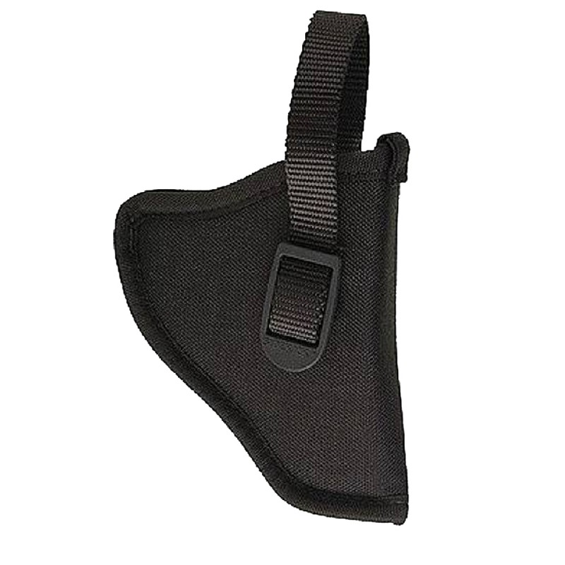Patented SIDEKICK laminate of Cordura nylon, water-proof closed-cell foam padding, smooth nylon lining. Memory quality of laminate molds to the gun for an excellent fit, yet returns to original shape when gun is removed. Medium high ride design...double-slotted molded belt loop lets you wear it on holster belt up to 2 1/4" wide or a standard trouser belt. Tough nylon web retention strap has combination adjustment buckle and sturdy snap for easy draw. Patented nylon web sight channel.