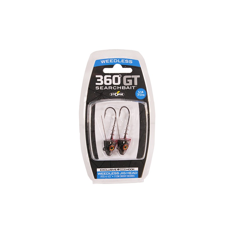 The 360GT Weedless Jig Head has a thin wire guard that allows you to fish in and around weeds with ease. Exclusive VMC Coastal Black hook with extended leg on line tie further enhances action. 60° angle keeps lure swimming in the perfect position. Life-like rattling jig head and 360GT bodies fit precisely, with color patterns that perfectly match regional forage.