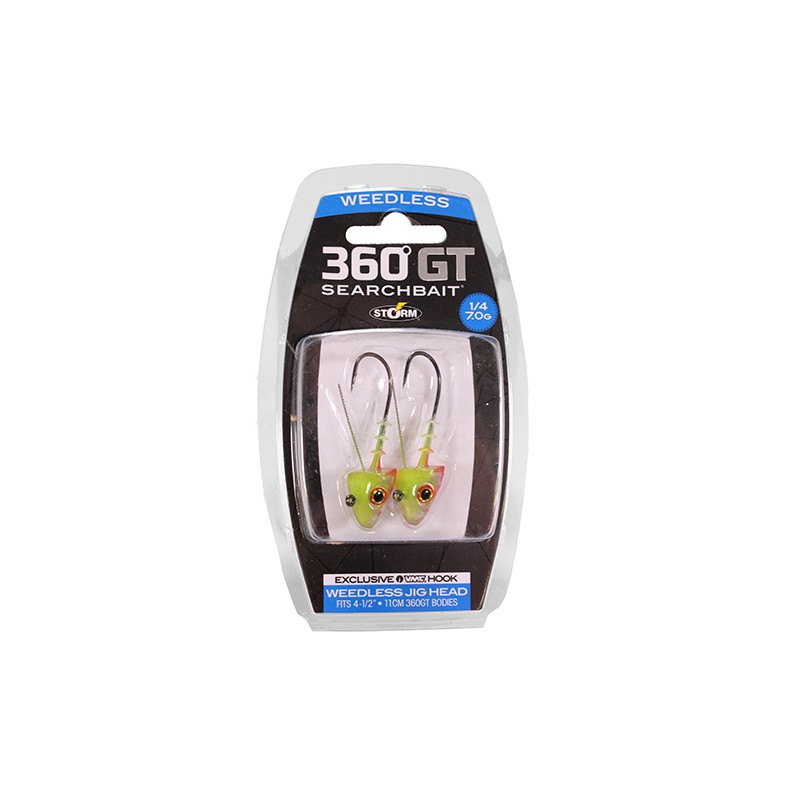 The 360GT Weedless Jig Head has a thin wire guard that allows you to fish in and around weeds with ease. Exclusive VMC Coastal Black hook with extended leg on line tie further enhances action. 60° angle keeps lure swimming in the perfect position. Life-like rattling jig head and 360GT bodies fit precisely, with color patterns that perfectly match regional forage.