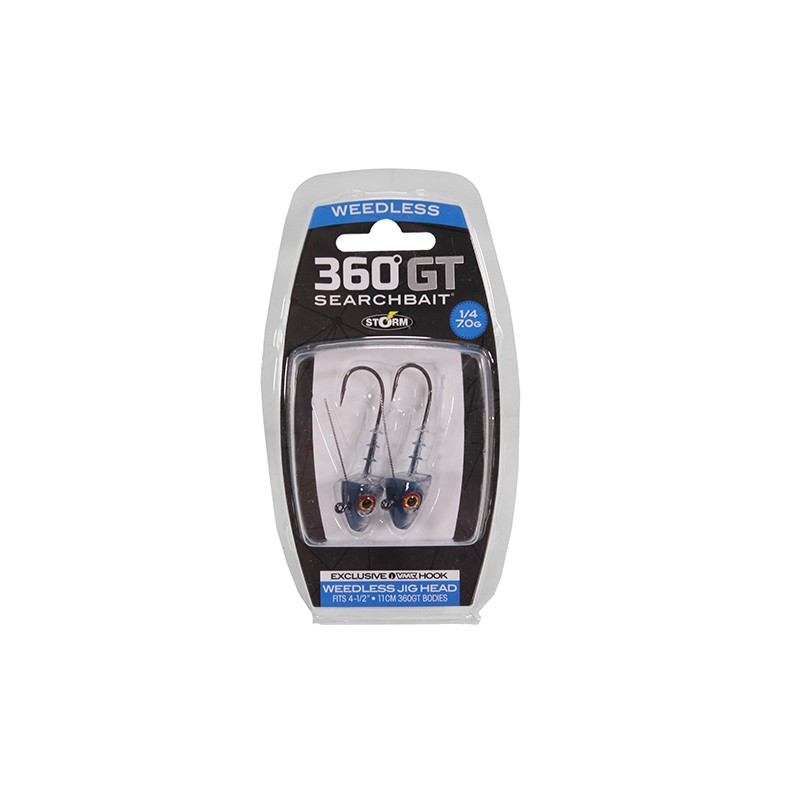 The 360GT Weedless Jig Head has a thin wire guard that allows you to fish in and around weeds with ease. Exclusive VMC Coastal Black hook with extended leg on line tie further enhances action. 60° angle keeps lure swimming in the perfect position. Life-like rattling jig head and 360GT bodies fit precisely, with color patterns that perfectly match regional forage.