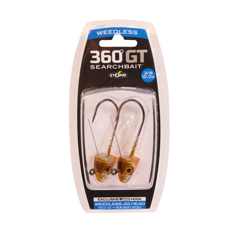 The 360GT Weedless Jig Head has a thin wire guard that allows you to fish in and around weeds with ease. Exclusive VMC Coastal Black hook with extended leg on line tie further enhances action. 60° angle keeps lure swimming in the perfect position. Life-like rattling jig head and 360GT bodies fit precisely, with color patterns that perfectly match regional forage.