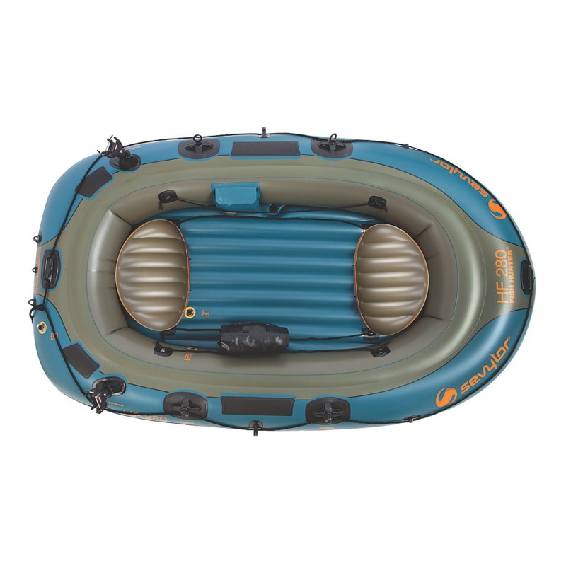 Fish will fear you when you hit the water in a Sevylor Fish Hunter 280 4-Person Fishing Boat with Berkley Rod Holder. Made from heavy-duty PVC, this boat is tough enough to get you to your favorite out-of-the-way fishing hole. Just in case, though, the multiple air chambers will help you get back to shore. Rowing is natural and easy thanks to the Delrin swivel oarlocks, raised inflatable seats and the anti-chaffing pads. But if you want to move more easily, you can always add an outboard motor or the Sevylor trolling motor. No matter how you power your craft, the tunnel air chambers will help keep your boat steady. Once you find your favorite spot, the Berkley Quick Set Rod Holder lets you adjust your pole angle for the ultimate hands-free fishing experience. Once you've landed your limit, this boat is easy to carry out of the water and the drain plug cuts down on drying time, so you can quickly pack up and look forward to your next successful fishing trip.