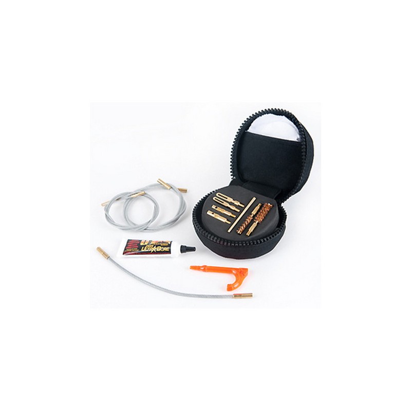 The All Caliber Rifle Cleaning System is ideal for all rifles including lever actions, bolt actions, and autoloaders. This premium cleaning system will clean all rifles from .17 caliber through .45 caliber. This kit contains three Memory-Flex cleaning rods a 30" cleaning rod, an 8" chamber cleaning rod, and a 34" small caliber cleaning rod with a brass slotted tip. Also included are two solid brass slotted tips, two brass obstruction removers to knock out mud, snow or a stuck case, a rod connector, a T-handle bar for added comfort when pulling a patch down the barrel, a .5 oz. tube of Otis O85 Ultra Bore Solvent, all-caliber cotton cleaning patches, and the .22 and .35 caliber bore brushes. The black nylon case comes standard with a locking zipper and belt loop attachment. Make your next hunt a success by using Otis.