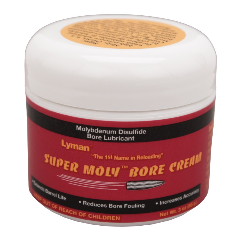 This Superfine Moly bore cream is applied directly to the bore. Brushed into the pores of the rifling, it smooths and polishes the surface to a black, shiny friction-reducing finish. This reduces bore fouling and increases barrel life as well as accuracy. Great with plain jacketed bullets and ever better when used with moly coated bullets for total performance.