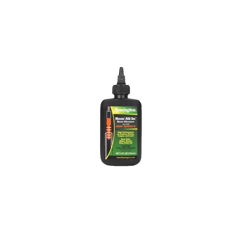 Easily break up all types of fouling with the Remington All In Bore Cleaning Solvent. The All In Cleaner is a water-based, high performance all-in-one cleaner that removes carbon, copper, plastic and lead deposits, while remaining safe for long term firearm care and making clean-up easy.