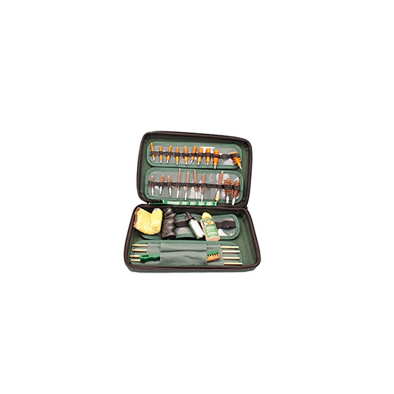 This universal kit is equipped with a 4-piece, 38" brass rod set with internal swivel to help conform to firearm's rifling, an innovative pistol grip rod handle with multiple attachment points, all ten size Rem Squeeg-Es and matching bronze bore brushes, two large cleaning brushes, a cleaning cloth, a 1 oz. bottle of Rem Oil and the newest addition to Remington's industry leading chemicals, a .5 oz. bottle of Rem All In Bore Cleaner.