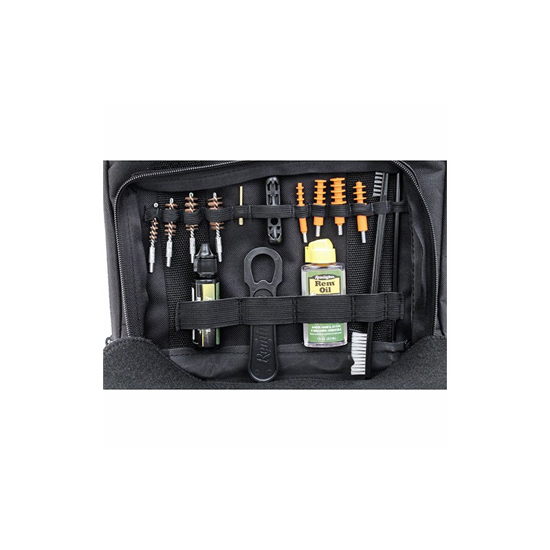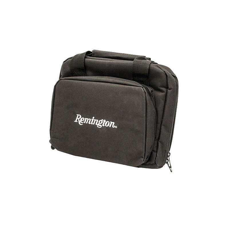 Remington's Squeeg-E Handgun Cleaning System is equipped with everything the avid handgun owner needs to carry their firearms into the field and clean them there or at home. A complete Rem Squeeg-E rod-based handgun cleaning system is placed in the front compartment of the heavy-duty, water resistant bag, that will eliminate the need for ineffective, messy patches. The bag also holds two full-sized pistols in a soft, cushioned interior with slots that hold up to 10 magazines.