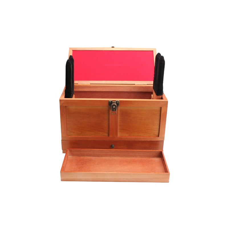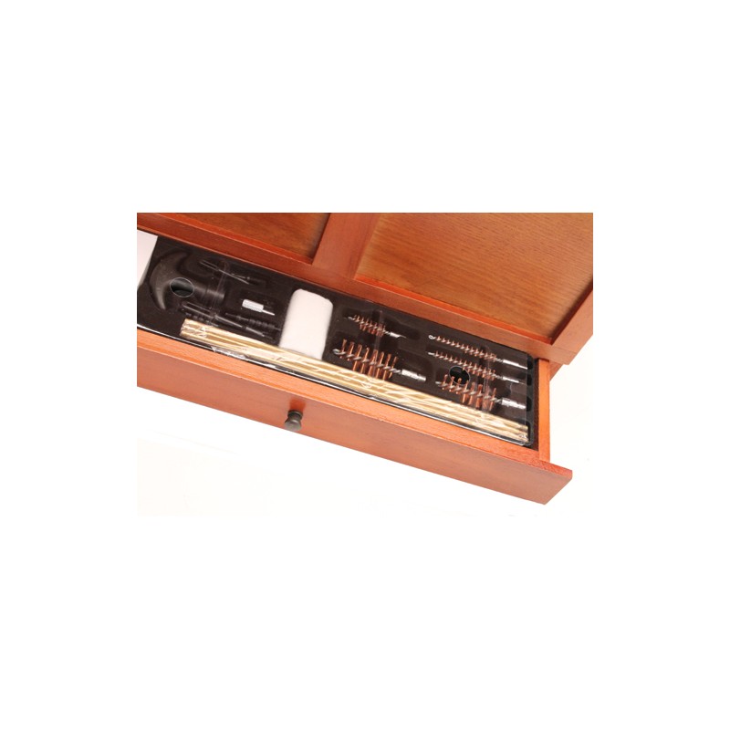 The Winchester Gun Cleaning Toolbox with 17-Piece Gun Cleaning Kit is a real wood toolbox with handle for easy transport. This toolbox has a removable tray for tools and additional cleaning items as well as removable cleaning racks fit most shotguns and rifles with plenty of storage.