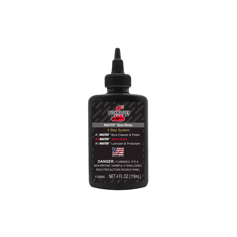 Bushmaster's Master Bore Rinse is specifically designed to remove fouling and residues loosened by the bore cleaner and polish. This quick-drying, alcohol-based rinse contains proprietary corrosion inhibitors and light oil, and it does not contain chlorinated solvents or ammonia.