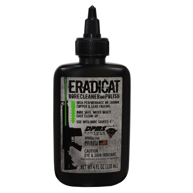 Easily break-up all types of fouling with the newest addition to the DPMS line of chemicals. DPMS EradiCat Bore Cleaner & Polish is a water-based, high performance all-in-one cleaner that removes carbon, copper and lead deposits, while remaining safe for long term firearm care and making clean-up easy. After breaking fouling loose with a bore brush, use the appropriate size Bore Squeeg-E, pulling from chamber through the bore to remove residue in just one pass.