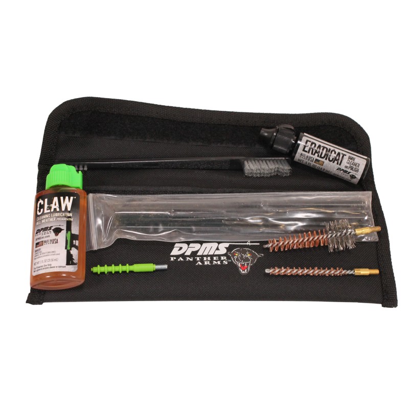 Revolutionary Bore Squeeg-E Technology that removes all dislodged barrel debris in one pass, eliminates the need for patches, reduces waste, saves you time and money, and delivers superior cleaning performance. Includes a 1/2 fl. oz DPMS Eradicat Bore Cleaner and Polish, a water-based cleaner that's bore safe, makes clean up easy and delivers high performance on carbon, lead, and copper fouling, and a 1 fl. oz DPMS CLAW Cleaning Lubrication All Weather preventative that's specifically designed for modern sporting rifles. Two-sided cleaning brush to clean all other spaces and five piece, steel rod set comes with 8/32 threads on all rods for any length use. , pack mountable, water-resistant, heavy-duty canvas with rear-velcro straps, Velcro closures, and DPMS logo