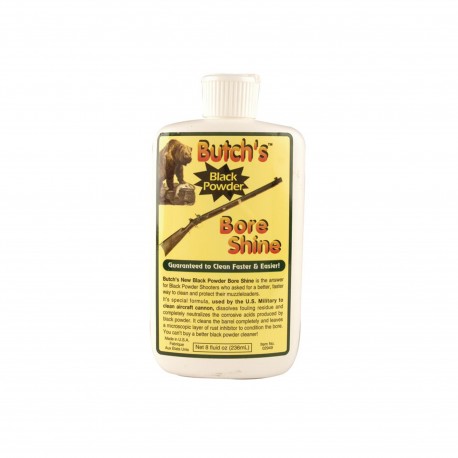 Butch's Black Powder Bore Shine was developed specifically for the Black Powder Shooter who asked for a better, faster way to clean their rifles. Butch's Black Powder Bore Shine comes from a special cleaning solvent used by the US Military. The Black Powder bore cleaner, like the original Bore Shine does it all. Removes powder, lead and plastic fouling faster than any other cleaner. Best of all it is odorless, non-toxic, non-flammable, biodegradable and protects against rust and corrosion. You can't find a better cleaner for black powder anywhere.