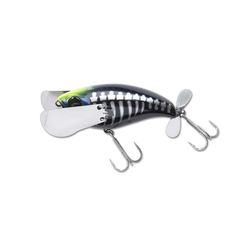 Featuring Jackall's 'magnetic center of gravity' system, the unique Pompadour topwater lure is designed with custom metal wings so it produces action with either a slow or fast retrieve. Both the rear hook and prop create noise and splash, while the large 3-inch body size pushed through the water.