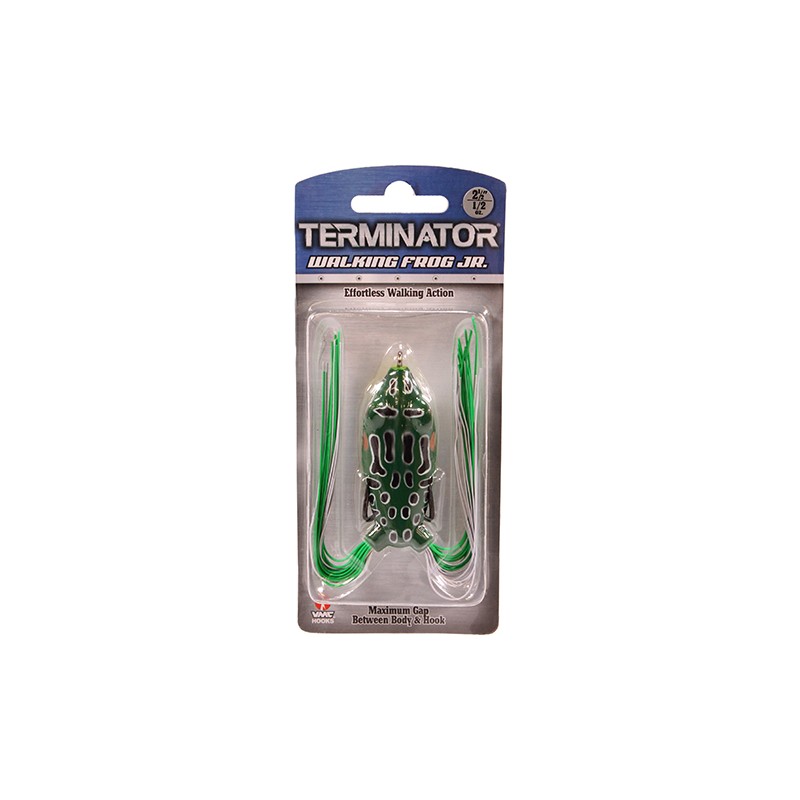 The Terminators Walking Frog works as good as it looks. Designed tip to tail to convert blow-ups into hook-ups, its a more productive frog, designed to maximize its hooks efficiency. Not only does it have a great walking action, it has features inside you cant see that make it a bait unlike anything bass anglers have seen.