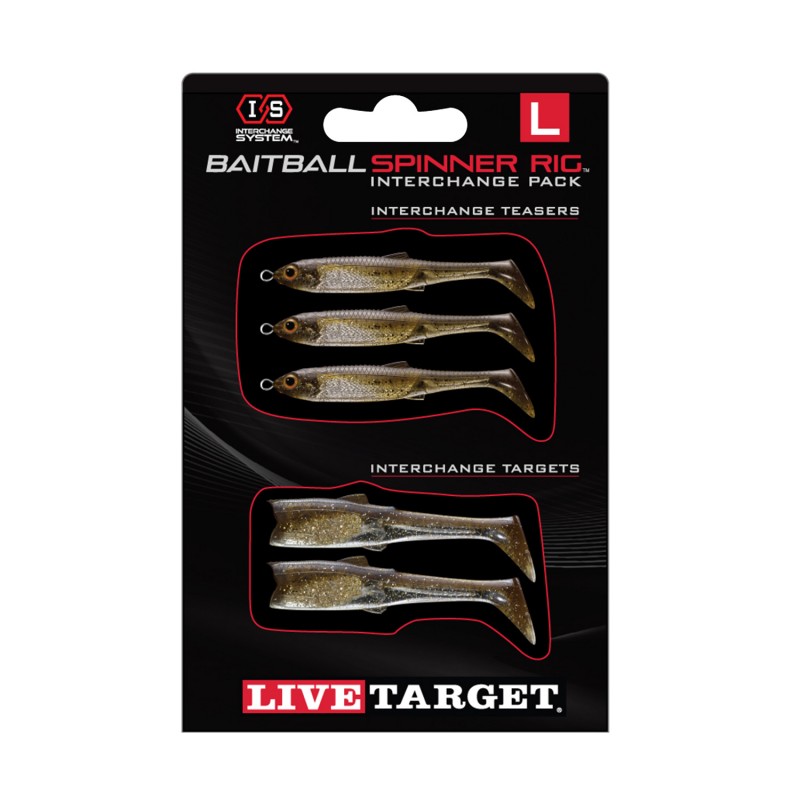 With three different wire-frame sizes and two weights in each frame, the LIVETARGET BaitBall Spinner Rig is a versatile lure which can be fished at any depth zone. The three Teaser bodies and willow blade create a vibration and flash which call in nearby game fish. When the predator sees the BaitBall, they will strike the Target body which is strategically placed away from the Teaser fish in the BaitBall. Anglers are able to utilize the Interchange System to quickly change or customize colors on the lure. Offered in 8 colors to match various water color conditions. Interchange packs sold Separately. Freshwater and Saltwater.