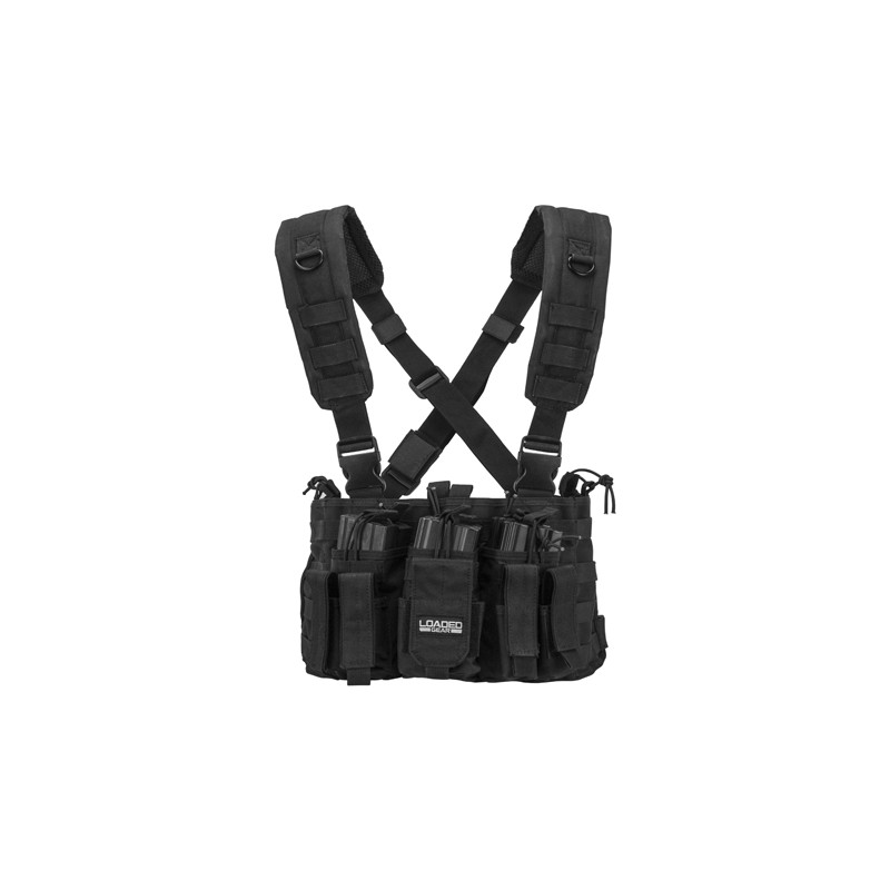 Durable tactical chest rig that keeps tactical essentials organized and close at hand. Adjustable to fit most adult body types. Tough mesh webbing designed for maximum ventilation and durability. Split front chest rig straps with padded shoulder straps with webbing cross back that feature D-rings on either shoulder. 3 section sleeves with velcro closures for body armor plates located on the front and sides of the chest rig (body armor plates not included). Internal mesh pocket on the front inside of the vest. Webbing system to carry additional gear. Front of chest rig features a 3 mag stacker and 6 accessory pouches for additional items.