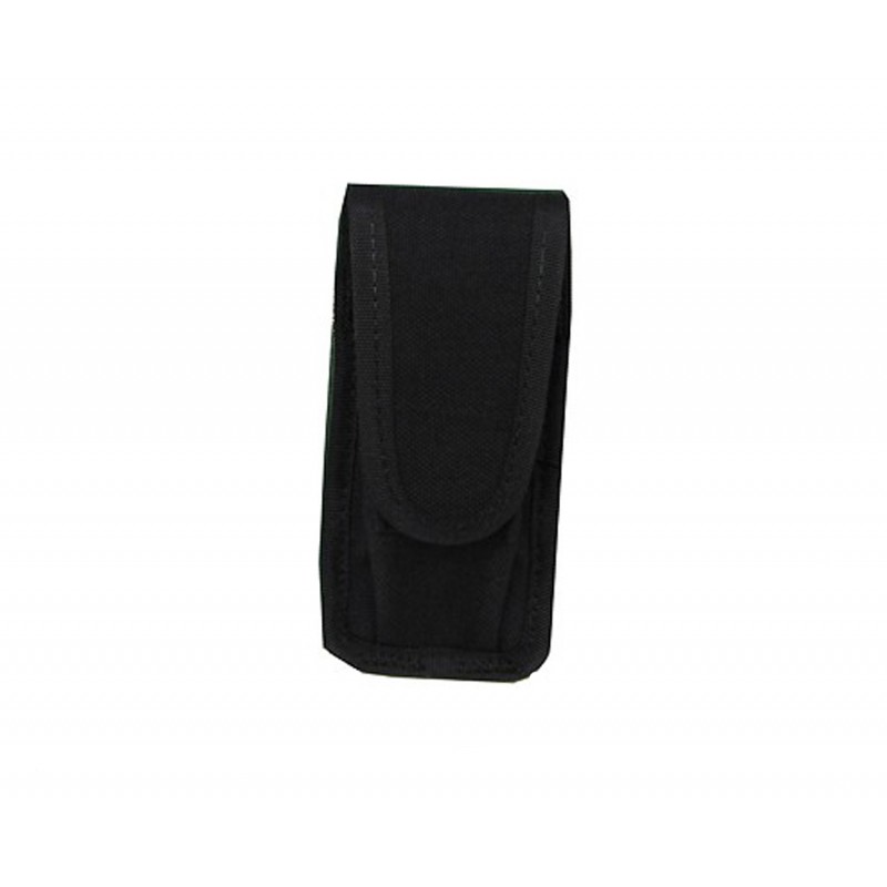 Cordura nylon outer shell. Back wall padded for comfort padded flap has knit lining. Fits most standard 9mm, .40 and single row .45 and 10mm magazines. Also ideal for carrying large folding knife or police type automatic knives. Rounded flap has Velcro closure. Belt loop fits belts up to 2 1/4" for vertical carry up to 1 1/2" for horizontal carry.