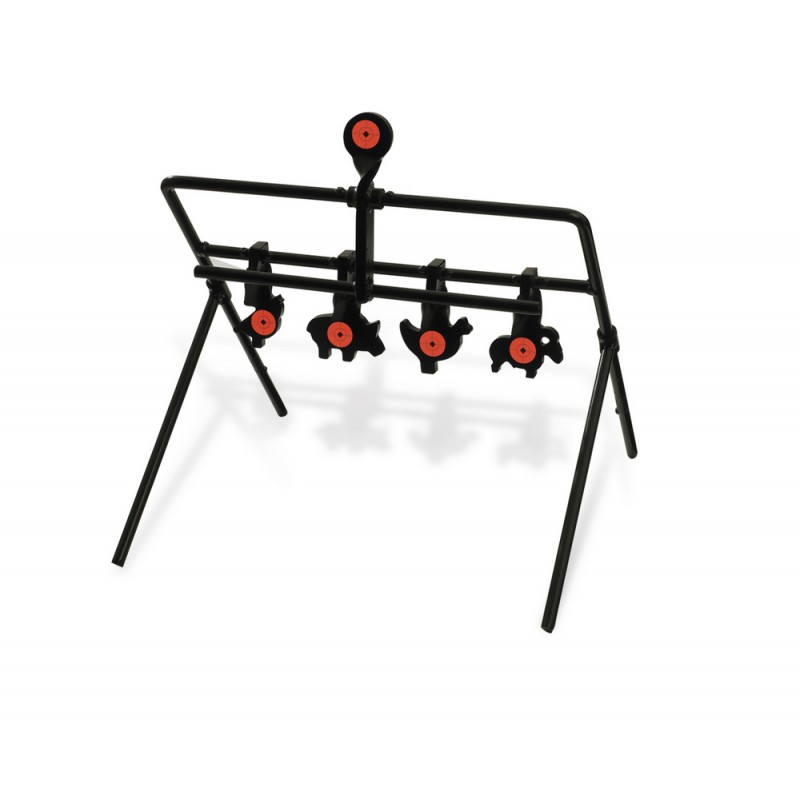 Get the hottest new targets for plinking enthusiasts! Extremely convenient, you'll experience hours of shooting fun with your .22 rimfire or airgun, without having to walk down range or pull chords to reset. Simply hit all four hanging targets and then shoot at the resetting target and all four targets drop back down for another round of shooting fun. And, with no assembly, parts or tools required, these targets set-up fast and come with a lifetime guarantee from breakage! Airgun version requires a moderately powerful airgun (approximately 500 feet per second or faster) with lead pellets only to operate effectively.This version of the Gallery Resetting Target includes animal silhouettes, each one is proportionally sized to meet the standards of NRA shooting distances at 40 meters.