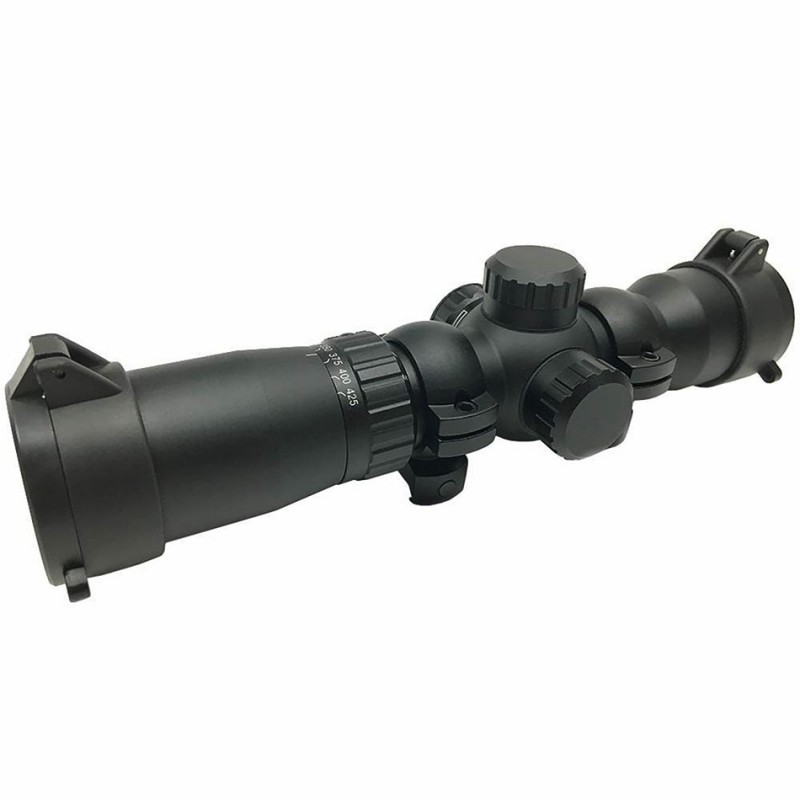 This Ravin scope is a 8.75-inch aluminum scope features a variable speed and arrow drop-compensation setting for crossbows that shoot between 300 and 425 FPS. Nine dot calibrated for 20-100 yards with a wide field of view. Rheostat controlled, illuminated colored dots (red or green). An etched glass reticle and fully multi-coated lenses 1.5 to 5x optics. Flip up protective lens caps. Fog and weatherproof. Shock and recoil proof. Mounting rings (7/8) included.