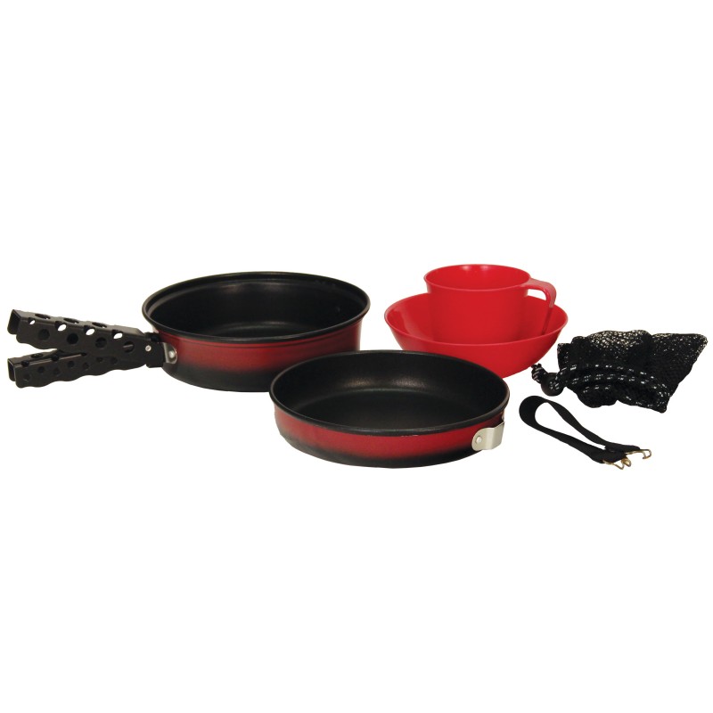 - Kit contains: Teflon 1 qt. sauce pan, Teflon 7-1/2" x 1-1/2" fry pan/lid, 6" bowl, 12 oz. cup, pan gripper, and mesh carry/storage bag