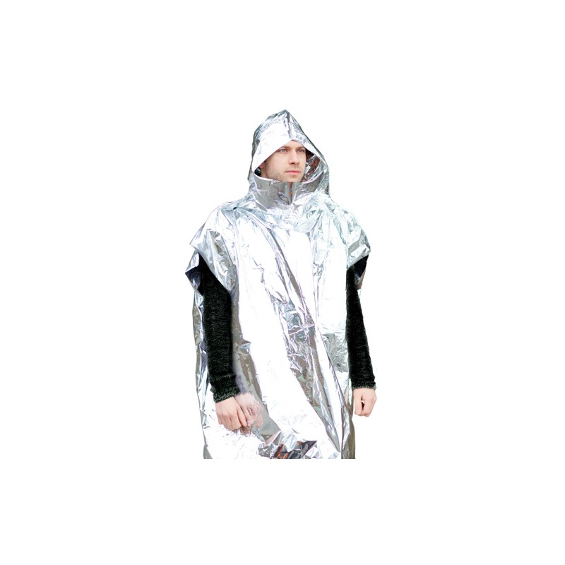 The Survival Poncho can help reduce heat loss in situations where hypothermia is possible. Made from a composite layering of polyethylene and metallized aluminum. Features a hood and reinforced seams in a rain poncho format to give maximum mobility in an emergency situation.