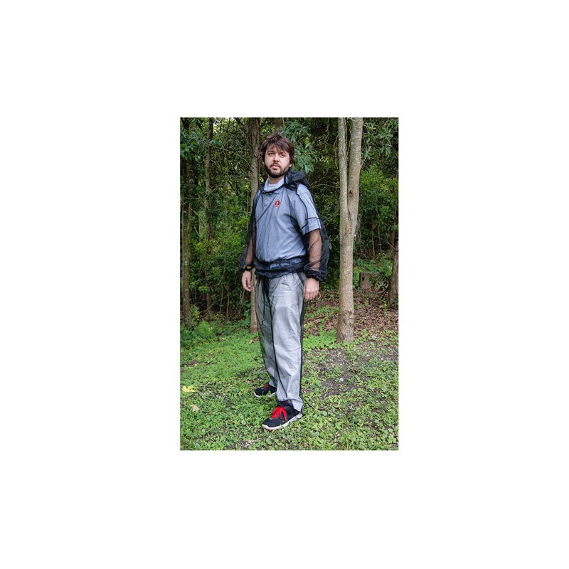 Constructed of 100 percent nylon no-see-um material, the lightweight, durable UST No-See-Um Suit with jacket and pants keeps flying, crawling, and biting insects off your skin. The jackets pullover hood zips completely closed, and the pants have comfortable elastic around the waist and ankles. Available in two sizes, its a great addition to any outdoor adventure, from backpacking and backcountry camping to hiking and hunting. (Note that if netting is tight against the skin it will not provide proper insect protection.)