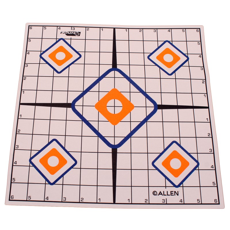 EZ Aim Sight Grid targets are ideal for sighting in your rifle or testing loads. The grid makes accurate scope alignment easy. Five separate aiming zones lets you maximize the use of each target, and the orange high-visibility diamonds are easy to see, even with iron sights. The colored areas flake when hit so you can easily see where your hits are landing.