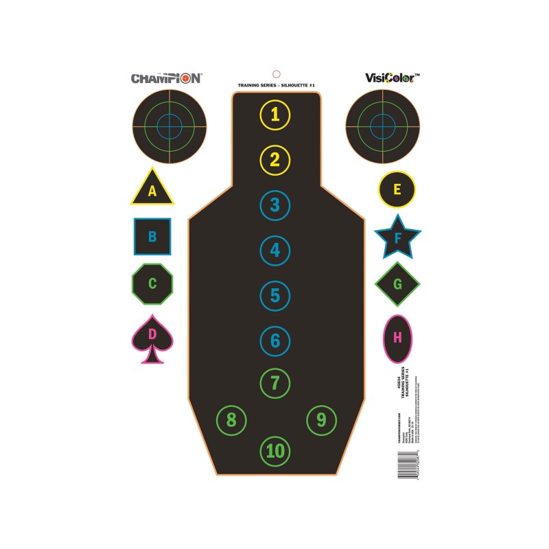 If you're looking to improve your reaction time and precision, hang up a new Champion VisiColor Training Silhouette target the next time you're at the range. The targets feature multiple numbers, colors and shapes to test your marksmanship and target acquisition skills. Each successful shot brings bragging rights and a burst of color.