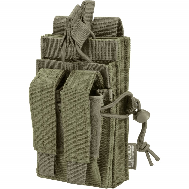 The CX-950 Loaded Gear Dual Stacked Rifle/Handgun Magazine Pouch from Barska securely stores, and provides easy access to, two standard M4/M16 30 round magazines or similar sized items. Bungee-cord retaining straps adjust the pouches for long or short magazines. The front of the pouch features two Velcro pouches for storing standard handgun magazines.