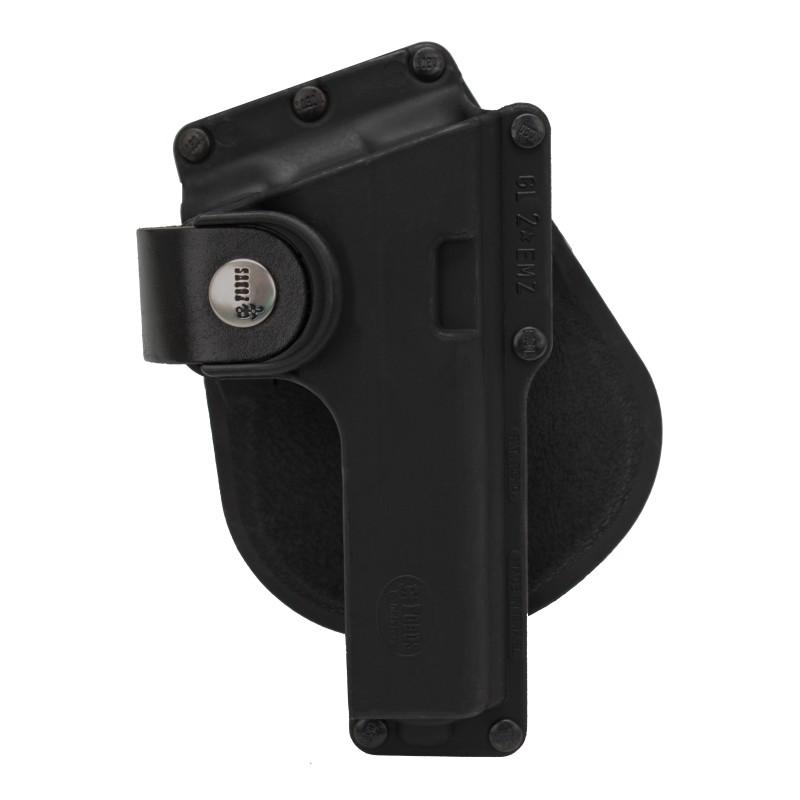 In addition to allowing the carry of handguns that have accessories such as lights or lasers mounted under the barrel or on the trigger guard, Fobus has addressed safety and retention concerns that are unique to this model holster. The handgun is held securely in place by utilization of a muzzle stud and a safety strap that encircles the trigger guard. While assuring positive retention, rapid presentation of the handgun is made easy due to the open withdrawal slot on the rear of the holster and the design of the safety strap.